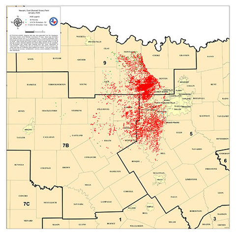 The Barnett Shale is a hydrocarbon-producing geological formation of great economic significance to Texas. It consists of sedimentary rocks and the productive part of the formation is estimated to stretch from the city of Dallas west and south, covering 5,000 square miles (13,000 km²) and at least 18 counties in Railroad Commission of Texas Districts 5, 7B and 9. The Barnett Shale is one of the largest onshore natural gas fields in the United States. The field name for the productive portion of the Barnett Shale formation has been designated as the Newark, East (Barnett Shale) Field by the Railroad Commission of Texas. The shale was named for the Barnett Stream, where in the early 20th century during a mapping exercise, geologists noted thick, black organic-rich shale in an outcrop close to the stream, which was named for John W. Barnett who settled in San Saba County during the late 19th Century.