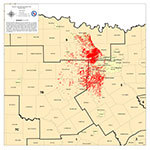 January 2026 | 19”x19” | $19.00 | Active permit (blue) and Producing Gas (red) and Oil (green) well in the Newark, East (Barnett Shale) field. Major cities, Railroad Commission Districts and county boundaries. |